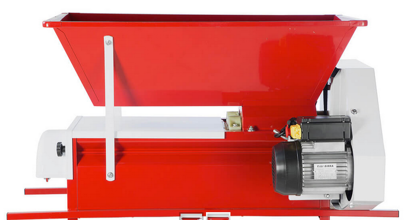 Boabele zdrobite impreuna cu mustul rezultat vor cadea gravitational prin orificiile cu diametrul de 22 mm ale cilindrului din inox plasat sub cuva, in cada sau butoiul pe care se sprijina dispozitivul.